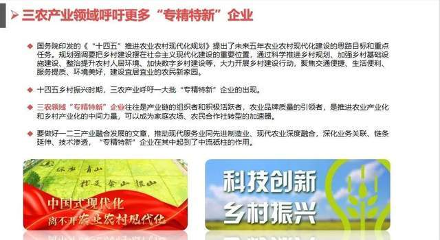 另外,袁帅呼吁三农产业领域呼吁更多“专精特新”企业。他表示,十四五乡村振兴时期,三农产业呼吁一大批“专精特新”企业的出现。三农领域“专精特新”企业往往是产业链的组织者和积极活跃者,农业品牌质量的引领者,是推进农业产业化和乡村产业化的中坚力量,可以成为家庭农场、农民合作社转型的加速器。所以,要做好一、二、三产业融合发展的文章,推动现代服务业同先进制造业、现代农业深度融合,深化业务关联、链条延伸、技术渗透,“专精特新”企业在其中起到了中流砥柱的作用。
