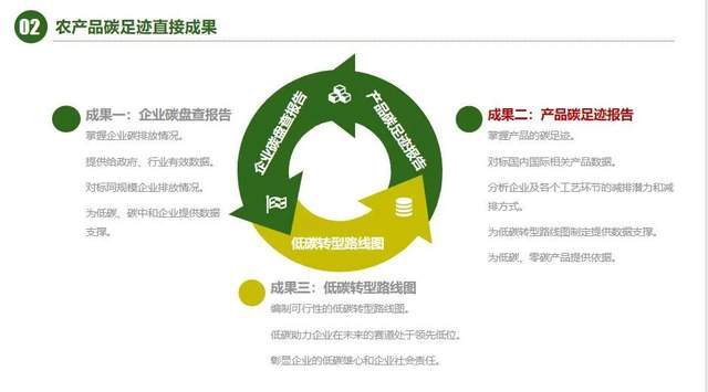 段老师还分享到,目前双碳背景下农业产业的最佳切入点:农产品碳足迹。其中,碳足迹是农业产业各个领域和板块针对双碳发展中必不可少的重要措施和实施路径。农业市县、企业在自身及上下游等各环节,依托于LCA全生命周期的碳足迹进行开发和计算,能够有效保证在双碳事业中长期持续地保持领先地位和多方面价值增长。截至目前,农产品碳足迹直接成果可以实现企业碳盘查报告、产品碳足迹报告、低碳转型路线图等三大成果,助力农业生产企业双碳目标及碳资产变现。