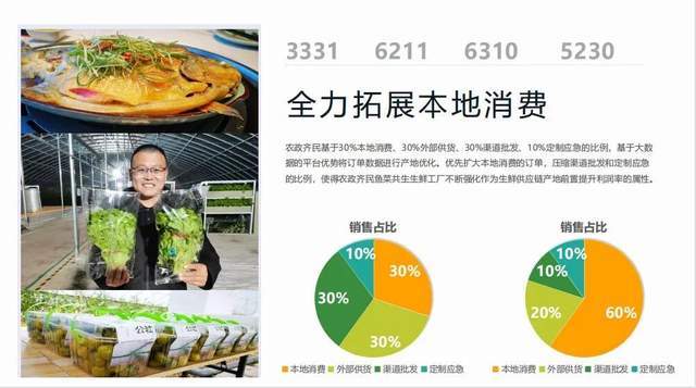 高上还分享到:农政齐民正在全力拓展本地消费。截至目前,农政齐民基于30%本地消费、30%外部供货、30%渠道批发、10%定制应急的比例,基于大数据的平台优势将订单数据进行产地优化。优先扩大本地消费的订单,压缩渠道批发和定制应急的比例,使得农政齐民鱼菜共生生鲜工厂不断强化作为生鲜供应链产地前置提升利润率的属性。