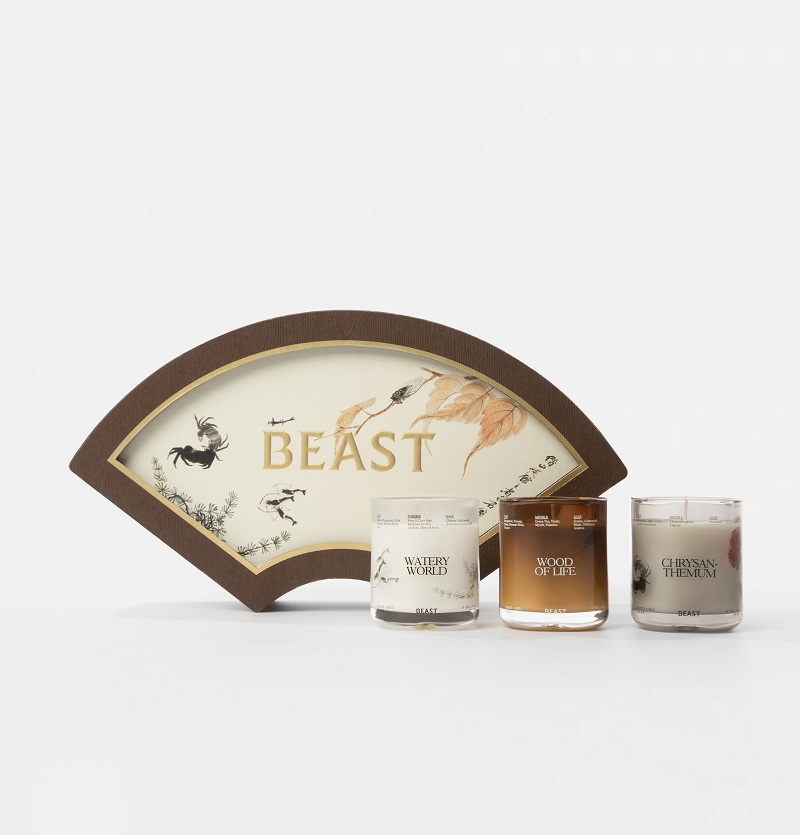 “秋意浓”系列的第二款礼盒,是一款精致的小香扇,以苏式花窗为灵感,白石老人笔下的秋蝉、落叶、螃蟹、菊花……让秋日氛围,呼之欲出。礼盒内含三款野兽派秋季新香——采菊东篱,是绿意花香调;水生万物,是水生芳香调;生命之木,是龙涎木质调。中秋月下,携礼而来,浅闻新香,愿你的小小世界,温暖安定。