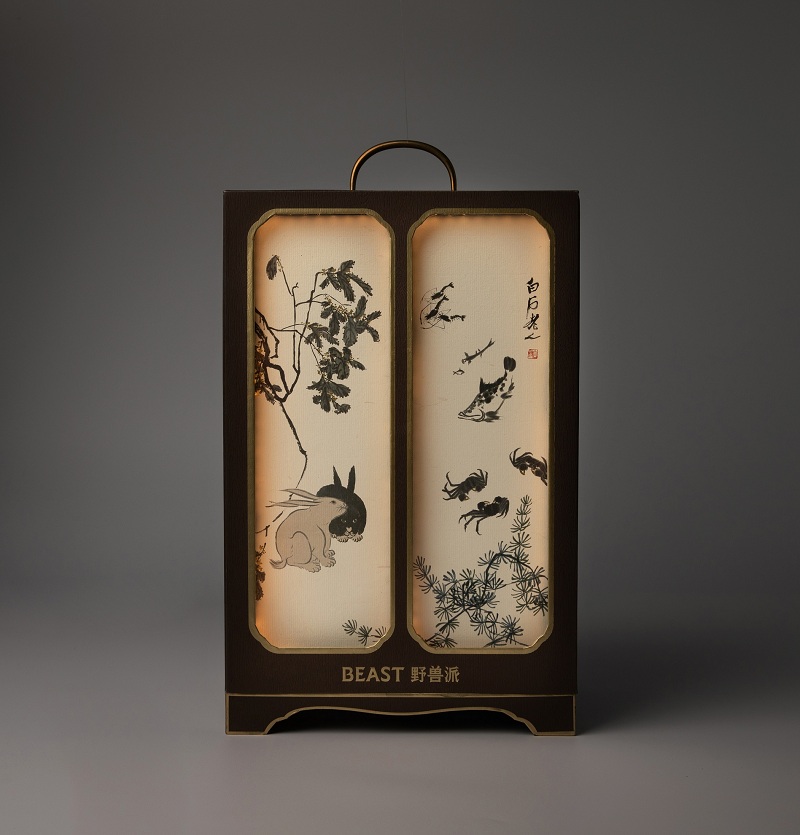 此次“秋意浓”系列中,野兽派特别推出了两款别出心裁的中秋礼盒。第一款礼盒,金秋暖香炉,以古代提箱造型为灵感,缀以双扇描金花窗,左窗为《桂花双兔》,金桂点点,双兔傍地走,代表团圆美好;右窗为《鱼蟹图》,是秋日的水生世界,代表盎然生机。向上提拉,打开礼盒,一盏秋日暖香炉,静待君启,它像是暮光中渐显的圆月,为归家之人,洒下月辉。搭配的蜡烛是野兽派秋季新香生命之木,代表深沉坚实的内在力量,向上生长,向下扎根。