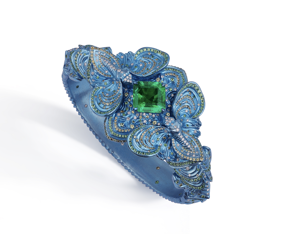 紫晨的作品充满浓郁的东方及自然特色,以他的代表作《空灵蝴蝶》为例,这只晶莹璀璨、美丽夺目的艺术品是用中国古老的镂空玉雕技艺,结合现代珠宝工艺制作而成,斑斓的宝石在巧妙设计下,成功打造出一只栩栩如生的蝴蝶,向观者静静述说大自然的美丽与神秘。这种对于自然之美的永恒追求,正是紫晨作品的灵魂,也是深藏在他内心丰富的灵感来源。