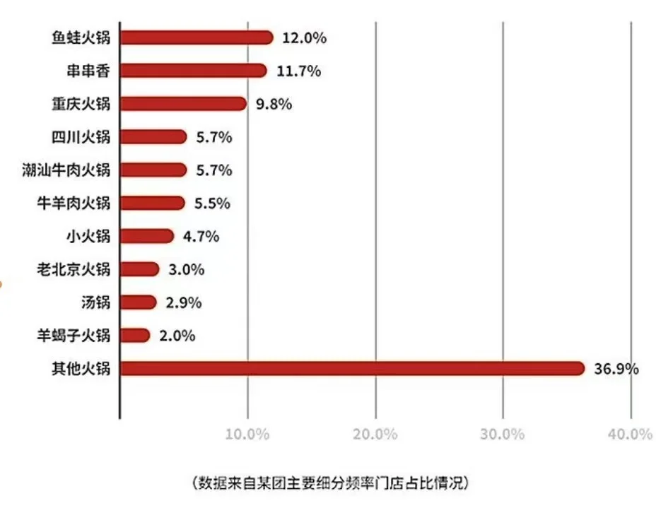 中国餐饮市场规模庞大,在2020年时中国餐饮市场规模便已突破5万亿,其中火锅市场规模占比近40%!而在这万亿的火锅市场中,又包含了众多的类别,如今,鱼蛙类火锅已成为继麻辣火锅之后的又一大热门品类。2019年,鱼蛙火锅的市场规模占比在9.23%,而到了2021年,就已经迅速发展到11.28%,2022年已经上升为火锅细分品类中的第一大品类。