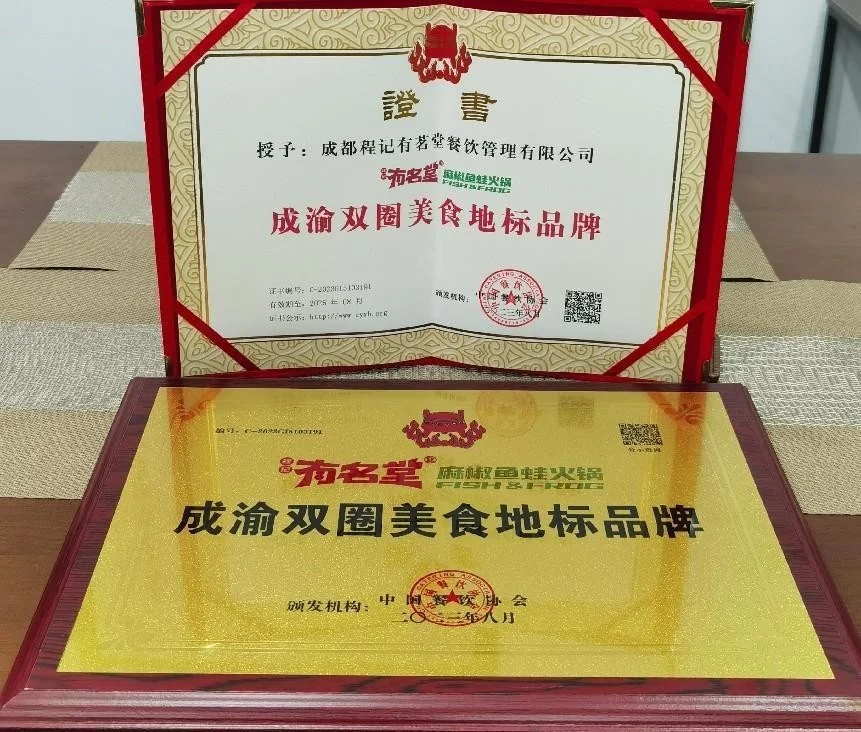 2023年8月25日,中国餐饮协会在北京举办了中国火锅行业特色连锁品牌评选活动,在本次活动中依据中国餐饮协会《区域美食影响力品牌评定标准》,由该协会多位行业资深专家初审后,经组织专家考察评审,结合大量市场数据,从全国参选的数十家火锅品牌中评选出由成都程记有茗堂餐饮管理有限公司旗下的“程记有名堂”麻椒鱼蛙火锅为“成渝双圈美食地标品牌”荣誉称号,现场进行公示,并颁发牌证。