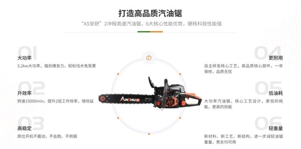 安舒牌高速汽油锯,作为一款高端级别的油锯,一直以来,以低油耗,高效率,轻重量被消费者所熟知。其稳定的机器性能以及极佳的操控舒适性,更是被广大用户评价为具有高性价比的油锯。在未来,安舒公司将持续以科技创新为动力,不断突破产品的性价比极限。为消费者提供更多质美价廉的产品。