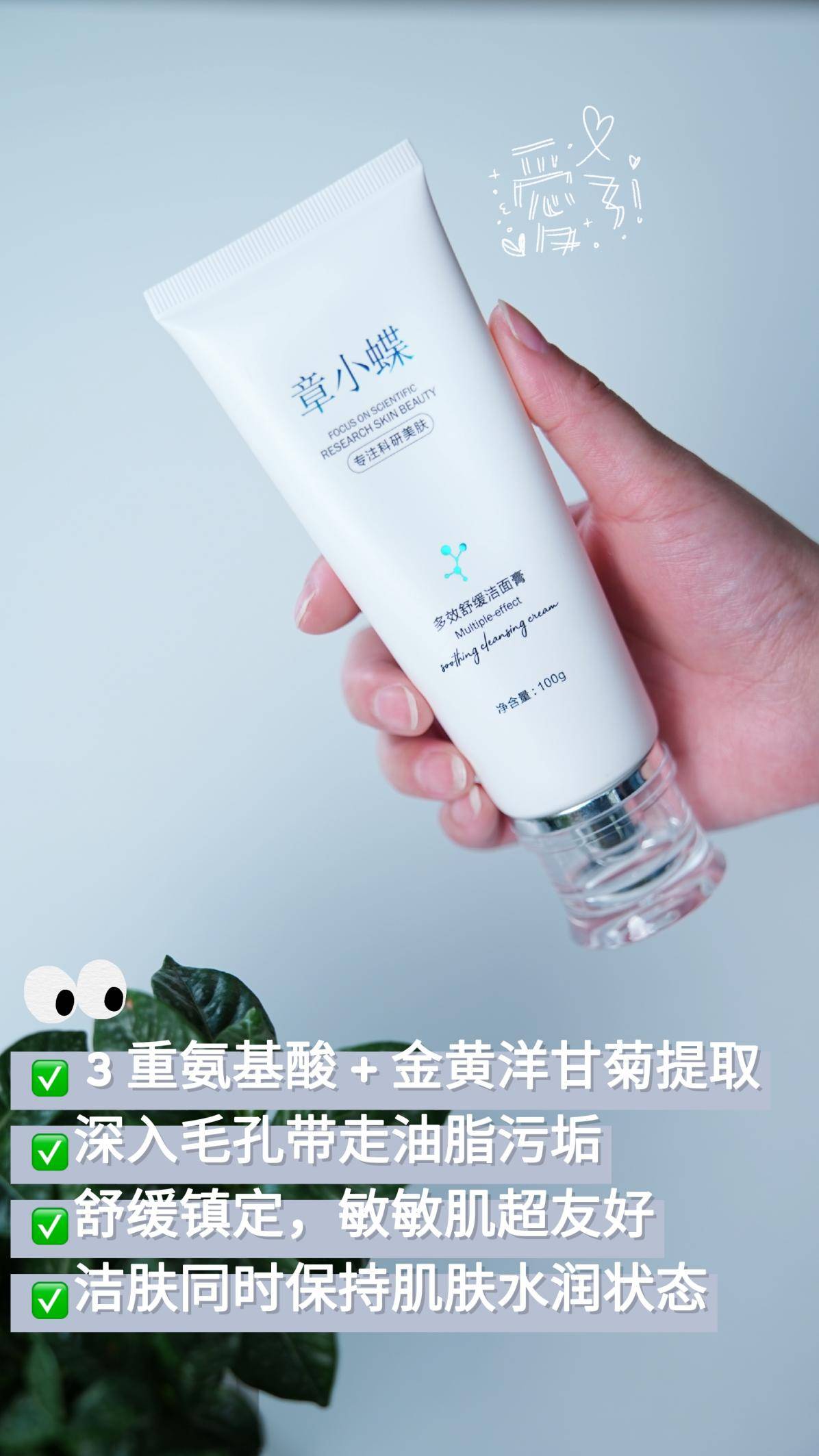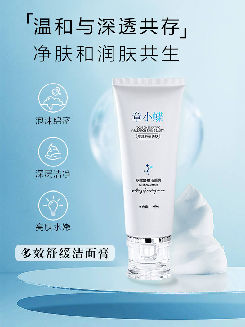 章小蝶多效舒缓洁面膏,三重氨基酸表活,温和洗护的同时,又做到了深度清洁。其中洋甘菊提取物成分,洁面同时深层舒缓修护肤况,让皮肤维稳在净澈状态。