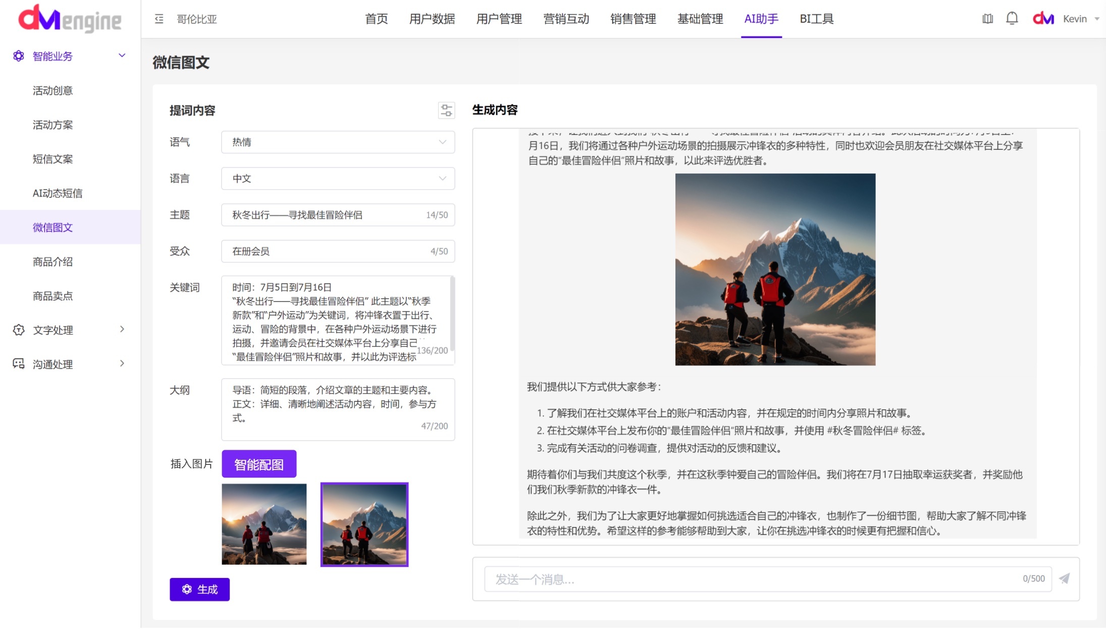 在数字营销领域,HCR将AIGC嵌入到已有的DMengine平台,可根据差异化的用户特征属性,生成营销内容和话术,包括营销短信、微信图文、小红书通稿、营销文本的改写续、短视频脚本、口播稿等。