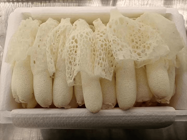 生鲜果蔬类运输起来较为麻烦,珍惜菌类成熟后,同样有生鲜果蔬类存储的困扰,在1到5℃的环境中存放超过5天后会出现变质的情况,市面上流通的珍惜类食用菌以冻存和除水烘干的两种类别。冻存的热工成高,能源消耗大,经济成本高,容易变形;除水烘干的泡发时间长,营养流失比率高,泡发时间长。基于现有问题,菌硕生物公司技术骨干研发出一套生物型保存体系,在不添加添加剂的情况下制备出珍惜菌类的预包装品(预制菜),常温环境存放时间超过六个月,可长时间运输,开袋开罐即可正常使用。