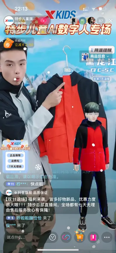 当天19:30,在特步儿童官方账号的直播活动中,这位名为“小步”的AI少年携手真人主播为粉丝们送上一场让人眼前一亮的儿童换装秀。1个小时的直播展示中,在线观众数量提升3.5倍,销售额提升3倍。小步频繁换装,不时摆出潮酷POSE,炫出科技光环,展示“大国少年”特质。