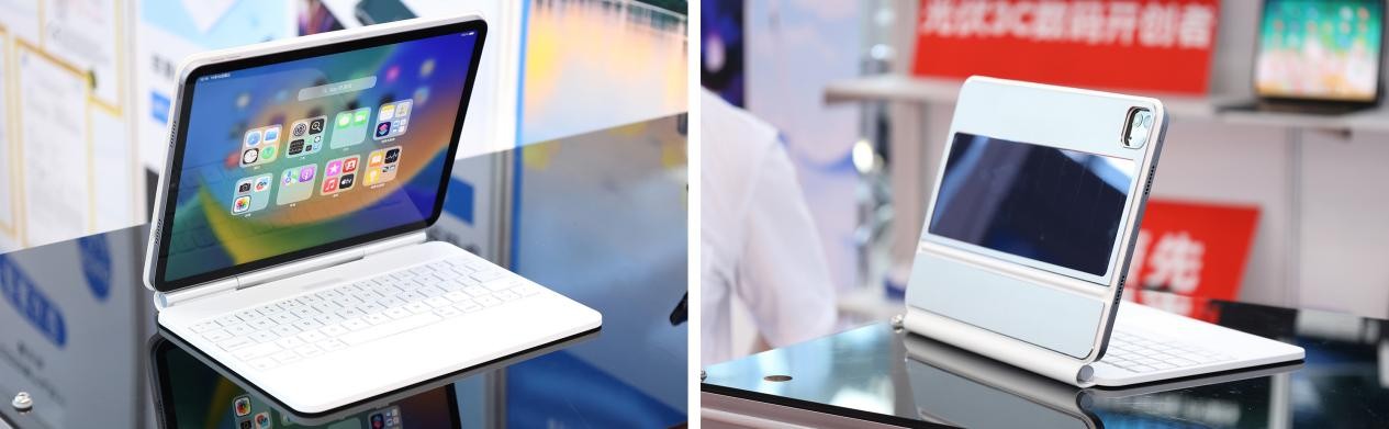 酷士达展位的重磅产品之一就是光伏新能源妙控键盘,许多观众为之驻足,深入了解之后更是爱不释手。这款新品最大亮点在于其光伏充电技术,它自带光伏板,能够利用日光或灯光进行自动充电,实现了妙控键盘的超长续航!IPX7级防水、磁吸悬浮、智控数显等功能也引起了现场观众的好奇心,他们争相体验这款创新的产品。