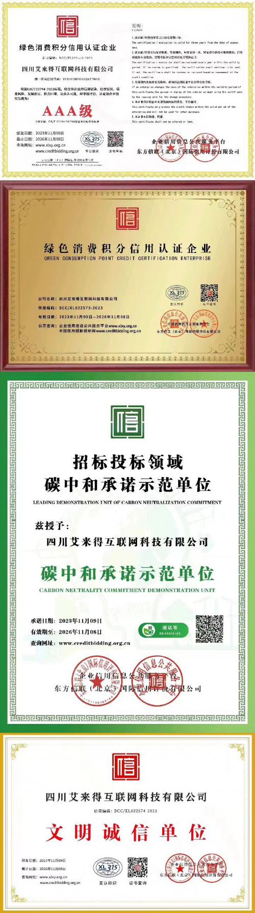 近日,由企业信用信用公共服务平台和东方信联(北京)国际信用评价有限公司为爱来得旗下公司四川艾来得互联网科技有限公司颁发了AAA级信用企业、招标投标领域碳中和承诺示范单位、文明诚信单位、绿色消费积分信用认证企业证书。“绿色消费积分信用认证企业”认证是一项重要的企业信用认证项目,该认证旨在鼓励企业提供优质产品和服务,树立良好的信用形象,并通过积分激励机制引导消费者进行绿色消费。爱来得全网连锁作为获得该认证的企业之一,将继续秉持诚信经营的原则,为消费者提供可信赖的服务和产品。