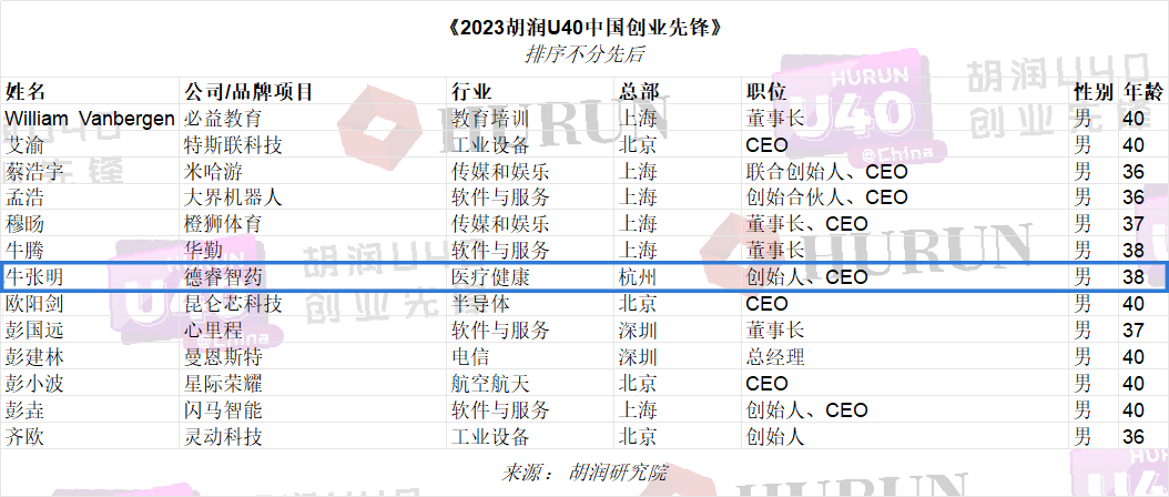 2023年11月6日,提供全球最大独角兽及未来独角兽榜单的胡润研究院发布《2023胡润U40中国创业先锋》(Hurun China Under40s 2023),「德睿智药」创始人兼CEO牛张明先生入选「2023胡润U40中国创业先锋」。
