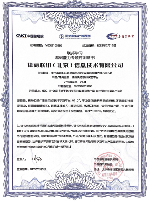 律商风险研发的“律商风险联邦学习平台”,于今年7月通过了中国信通院隐私计算产品相关评测,即“可信隐私计算”评测,获得“联邦学习基础能力专项评测认证”,标志着律商风险研发的联邦学习平台在调度管理能力、数据处理能力、算法实现、模型效果及性能、安全等方面获得了专业机构认可。