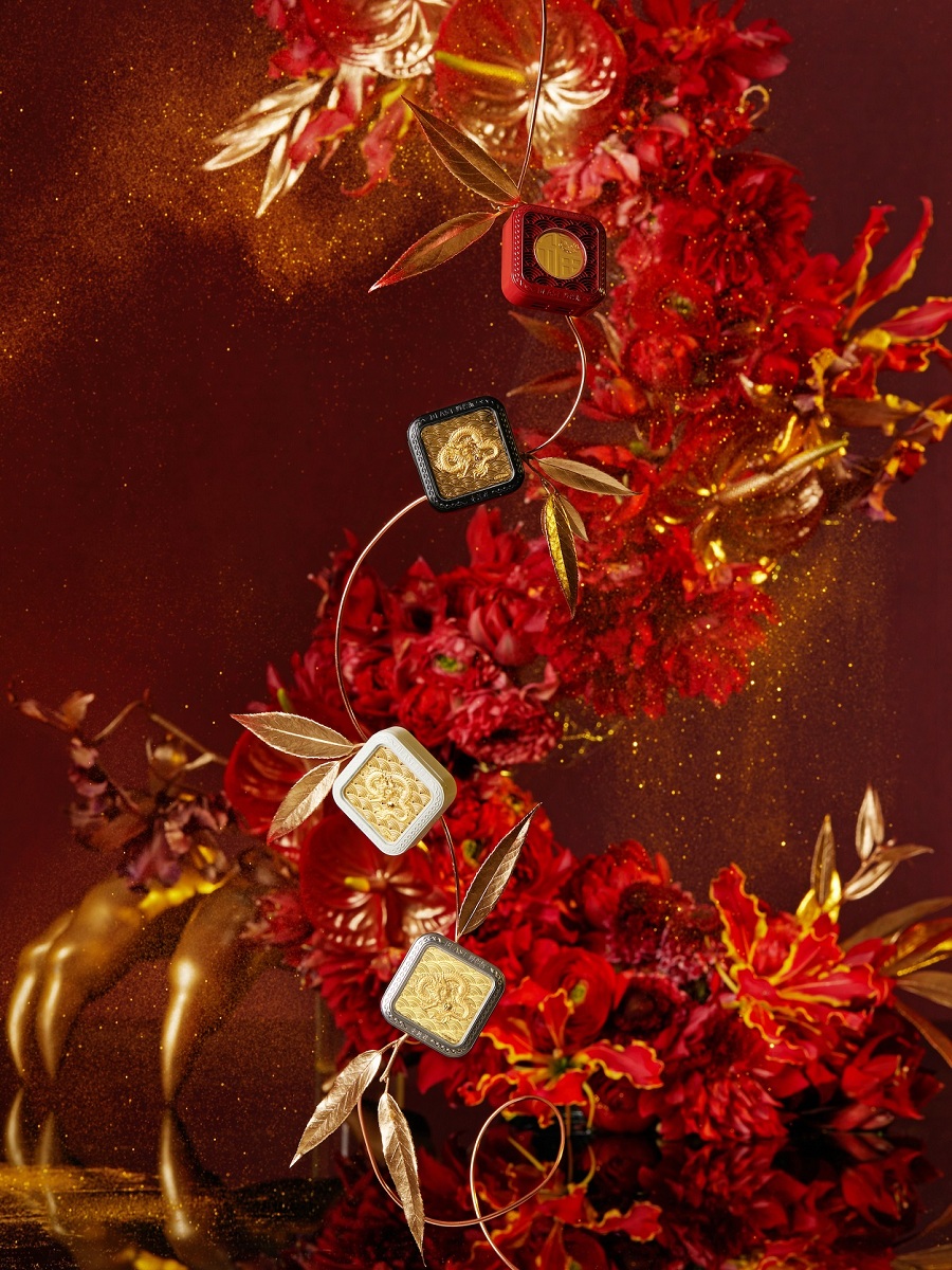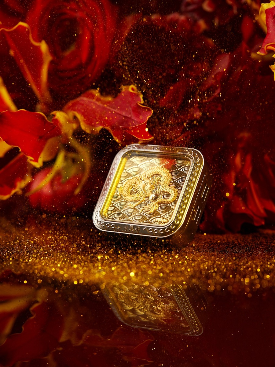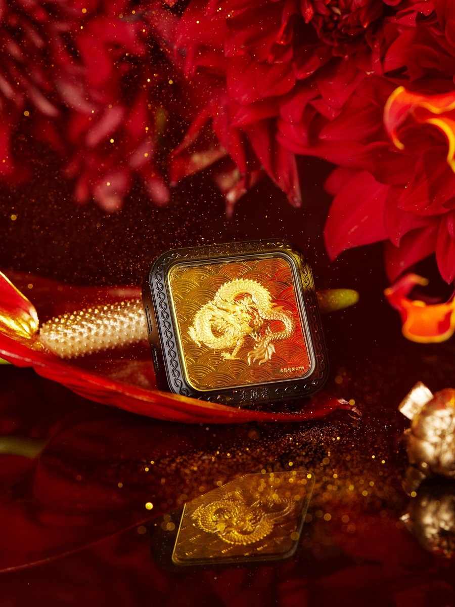 第二款龙腾四海,霸气十足,在层层叠叠的海浪纹间,金龙似在天地间自由翱翔,扶摇直上,寓意新年万事大吉,节节高升。龙身采用浮雕亮砂工艺,海浪纹分砂面与镜面,凸显层次感。金片由99.9%黄金经过熔炼,钆片,激光裁剪,退火,再经高吨位压机制作而成,采用造币工艺打造立体浮雕图案。龙首昂扬,口衔金珠,运转乾坤,龙鳞纹理细致入微,雕琢立体感,灵动线条,光芒熠动,耀现优雅。