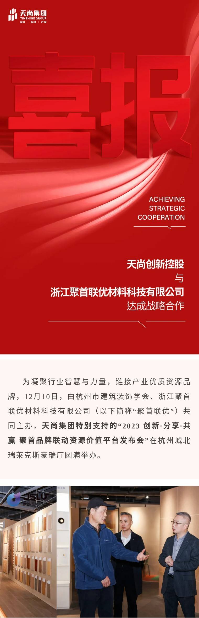 基于共享共赢的共同目标,天尚集团与浙江聚首联优材料科技有限公司签订了战略合作协议,双方将在积极拓展优质材料在建筑设计及工程中的应用场景,持续强化建筑设计与材料行业的深度链接,共同推动行业技术融合创新等方面开展深度合作。