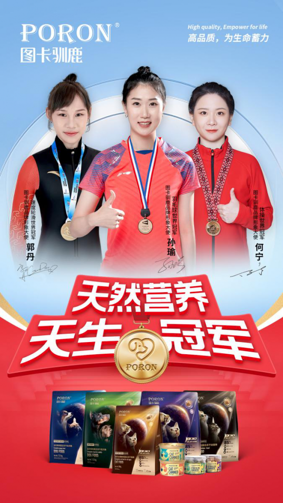 12月20日,在品牌周年到来之际,PORON图卡驯鹿宠物食品重磅宣布羽毛球冠军孙瑜、速度轮滑冠军郭丹、体操冠军何宁三位世界冠军出任品牌形象大使。此次强强联合,图卡驯鹿希望能够同世界冠军一起,为了毛孩家长的热爱与信赖,开发符合生物学性配方的产品,滋养更多宠物茁壮成长。