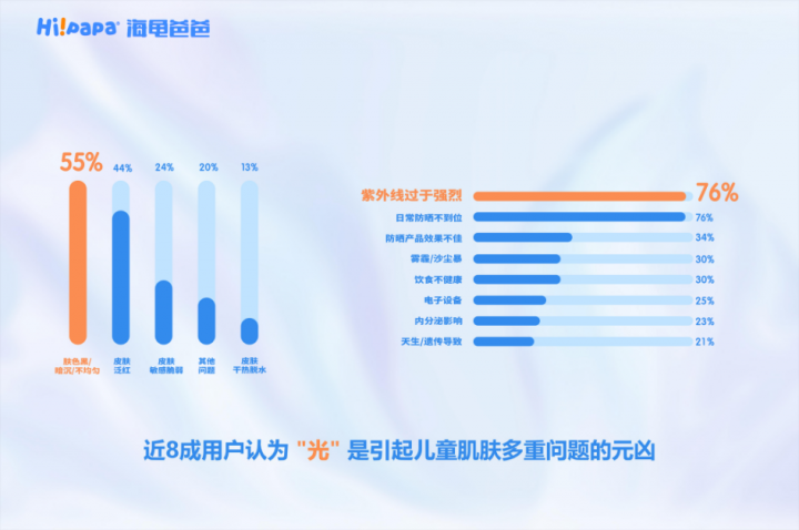 海龟爸爸全线抗光损产品正是基于真实消费者需求洞察而生的。Denise表示,在调研过程中,近8成用户认为“光”是引起儿童肌肤多重问题的元凶,而且“黑、敏、红”作为3大儿童肌高发问题,仍未得到有效改善。