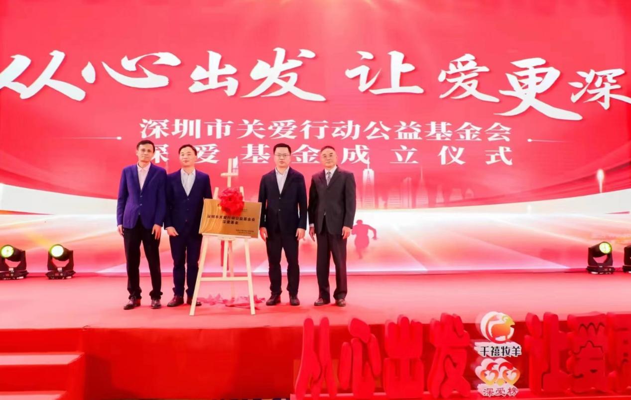 年会还举行了深圳市关爱行动公益基金会·深爱基金成立仪式。该基金由深爱榜、深圳十佳爱心人物袁子弹发起创办,成立的主旨在推动深圳关爱行动的深入开展,主要面向关爱热心公益的爱心人物、外来青年工作者以及助学、助劳、助困、助残等公益项目。深爱基金的成立旨在汇聚更多的力量和资源,推动社会的可持续发展。陈建中、袁子弹、盛齐鑫、王枣燕为深圳市关爱行动公益基金会·深爱基金成立揭牌。