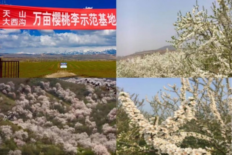 樱桃李春天开一色的花,结七彩的果,还有一柄结两果,一柄结三果,形成阴阳相抱、日月同辉现象。