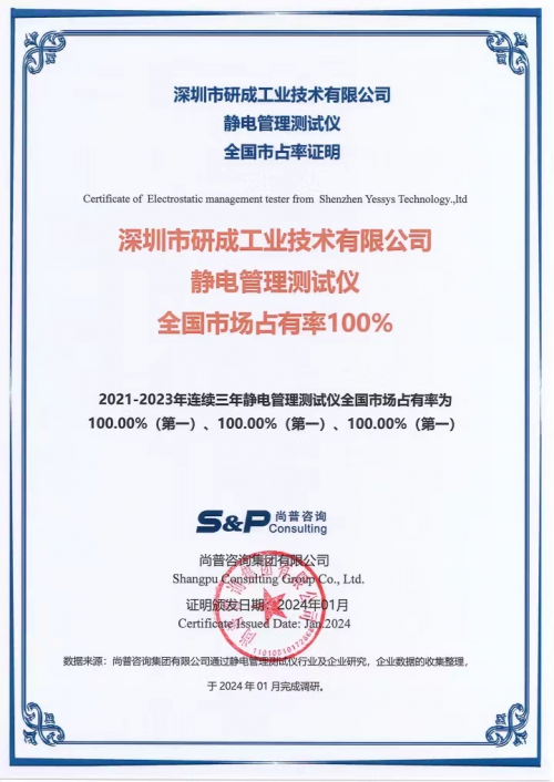 近日,权威市场调研机构尚普咨询集团发布了智能工业静电管理测试仪器行业市场占有率报告。报告显示,深圳市研成工业技术有限公司连续三年蝉联榜首,市场占有率高达100%,引发了广泛关注。本次报告数据来源于智能工业静电管理测试仪器行业情况及各企业2021-2023年相关营收数据综合汇总分析。