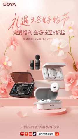 此次BOYA博雅麦克风开启了自家38节的促销活动。在天猫、京东、抖音平台共同推出了全场6折超值福利,2月28日开始,只要在以上官方店铺购买产品超过¥300即有机会获得品牌赠送的手机美颜灯一台。