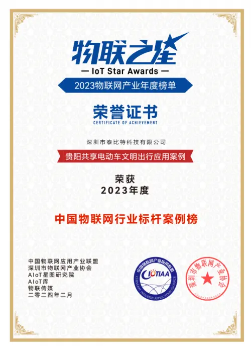 在本次“物联之星”评选中,泰比特“贵阳共享电动车文明出行应用案例”荣获中国物联网行业标杆案例。