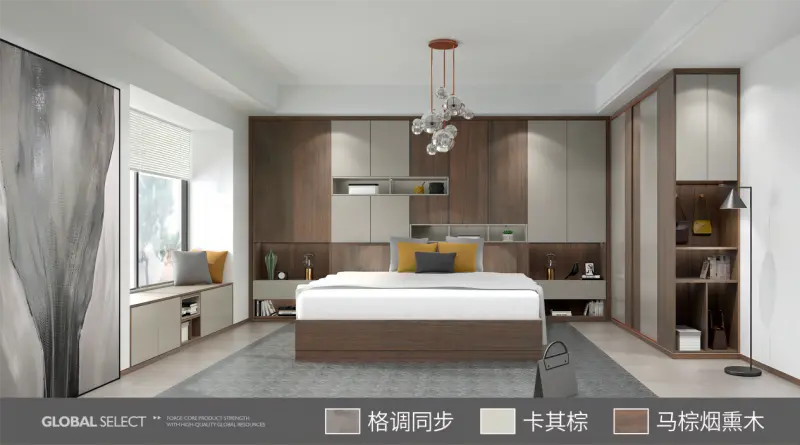 沉稳的色调,折射出消费者的高雅品味;同步的木质纹理,使消费者与森林无限亲近。大自然的包容性使这款木纹板材不限于衣帽间,书房一体柜,等大布局的使用,同时也适用于小面积的装饰,例如电视柜、电视墙。想象春光正好,数万里外的中东森林里也有相似纹理的树木正在同你一样沐浴阳光,绿色安心的板材让人放心休憩,这就是卡斯托莫可以给予给消费者的安全感。