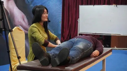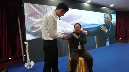 针灸治病最讲究的就是配穴。在此次线下培训课中,靳老师尽其所能地把家传治病经验和某些疾病的特效穴分享给在场学员,学员们纷纷表示收获很多。每讲到一个学员关心的病症,靳庆东老师都会邀请学员上台作为“模特”,亲自感受靳氏截针的针法。对于每一种病症在现场下针后,都会让学员对心中疑惑进行提问,并予以解答。