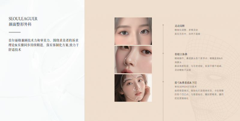 无论是灵动双眸的精细化调整,还是骨相立体鼻的精细操作,首尔丽格都能兼顾技术力和审美力,围绕求美者的诉求,理论与实操同步持续精进,落实客制化方案。眉弓、鼻基底、下巴等部位的整形手术,更是率先采用3DPEEK打印技术,按照骨面情况客制化打造假体形态,实现更精准、更精细化的雕刻。