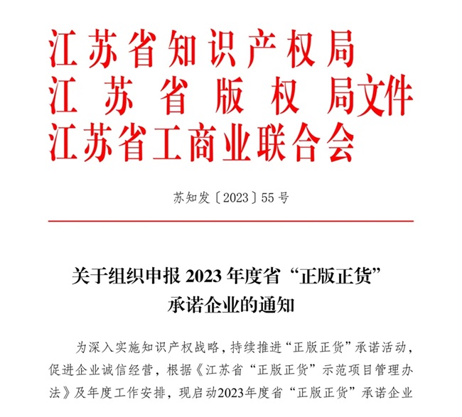 为营造尊重保护知识产权、诚信守法经营的良好社会环境,由江苏省市知识产权局、江苏省版权局、江苏省工商业联合会,根据《江苏省“正版正货”示范项目管理办法》规范企业诚信经营启动了“正版正货”承诺企业认定工作。