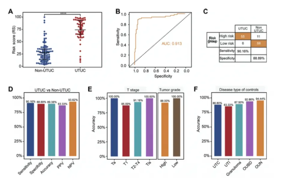 本前瞻性多中心临床研究收集了首都医科大学附属北京朝阳医院、北京大学第三医院、天津医科大学第二医院、北京中医药大学东直门医院和福建医科大学附属闽东医院共5家单位的160例患者的尿液样本,包括61例UTUC(肾盂癌和输尿管癌)和99例其他泌尿系统疾病(结石、尿路感染、肉芽肿等)。采用Canhelp®-UriBLAD Assay分析尿脱落细胞中特征基因的表达水平并计算风险分数(图2)。