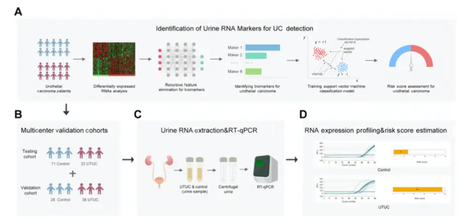 目前,临床上常采用输尿管软镜对UTUC进行检查,可确定约90%的病例。然而作为一种侵入性的有创检查方式,输尿管软镜费用高昂,还存在损伤泌尿系统和增加术后膀胱复发的风险,患者依从性较差。此外,尿液脱落细胞学作为无创检测的首选方案,具有良好的特异度,但灵敏度欠佳。多项临床研究表明尿液脱落细胞学检查的中位灵敏度和特异度分别为35%和94%,在早期或低级别尿路上皮癌中的灵敏度仅为16-36%,难以满足临床需求。因此,临床上亟需一种无创、灵敏、便捷、经济的技术用于UTUC的早期诊断和复发监测。