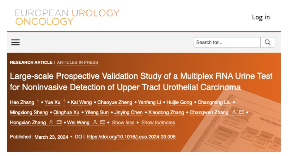1. Zhang H, Xu Y, Wang K, et al. Large-scale Prospective Validation Study of a Multiplex RNA Urine Test for Noninvasive Detection of Upper Tract Urothelial Carcinoma[J]. European Urology Oncology, 2024.
