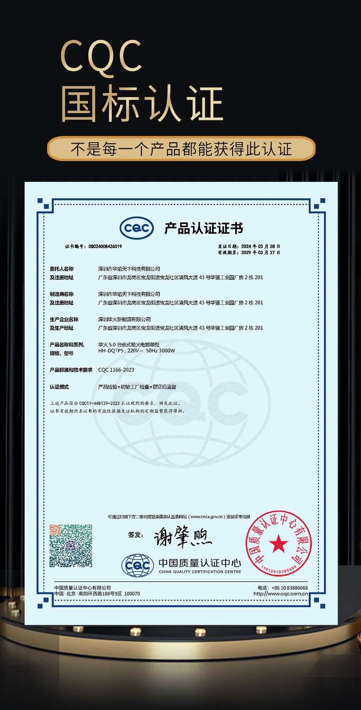引领烹饪新能源革命,华火新品凭卓越品质荣获权威认证。2024年3月28日,华火5.0 台嵌式喷火电燃单灶荣获中国质量认证中心(CQC)认证。