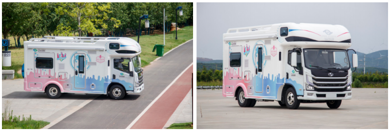 白色简约的浅色涂装车身、清爽的车身配色、6m以内蓝牌C照即可驾驶的车长、相比较于传统的实体店铺或是拖挂型商业房车,自由乌托邦房车有限公司自主研发生产的房车行动更灵活,可以在各街道、商圈之间穿梭,在人流量大的地方能够随走随停。车身外侧配备有4米手动遮阳棚,左侧尾部为营业窗口,下方设置有展示台。以“旅行赚钱两不误”的理念,营业区与车内其他生活区之间互不影响。车内操作间设置有冰淇淋机、咖啡机等设备,所有操作都能通过可视化人机交互一键控制。操作间外,合理的布设计在保证各功能区完备的同时,也留有宽敞的活动区域,床铺、沙发、电视、洗衣机、桌台等日常生活用品一应俱全。