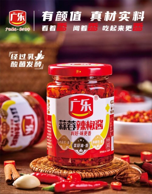 广乐蒜蓉辣椒酱,甄选优质非转基因菜籽油精心炒制,菜籽油自带的天然醇香与辣椒的深邃风味交相辉映,经过乳酸菌自然发酵的匠心工艺,不仅成功降低了盐分,更锁住了辣椒本身的鲜美口感与丰富营养。同时,人工精细去除多余辣椒籽,将蒜粒改为饱满的大颗,精心炒制出口感醇厚、蒜香浓郁、味辣多汁的辣椒酱。
