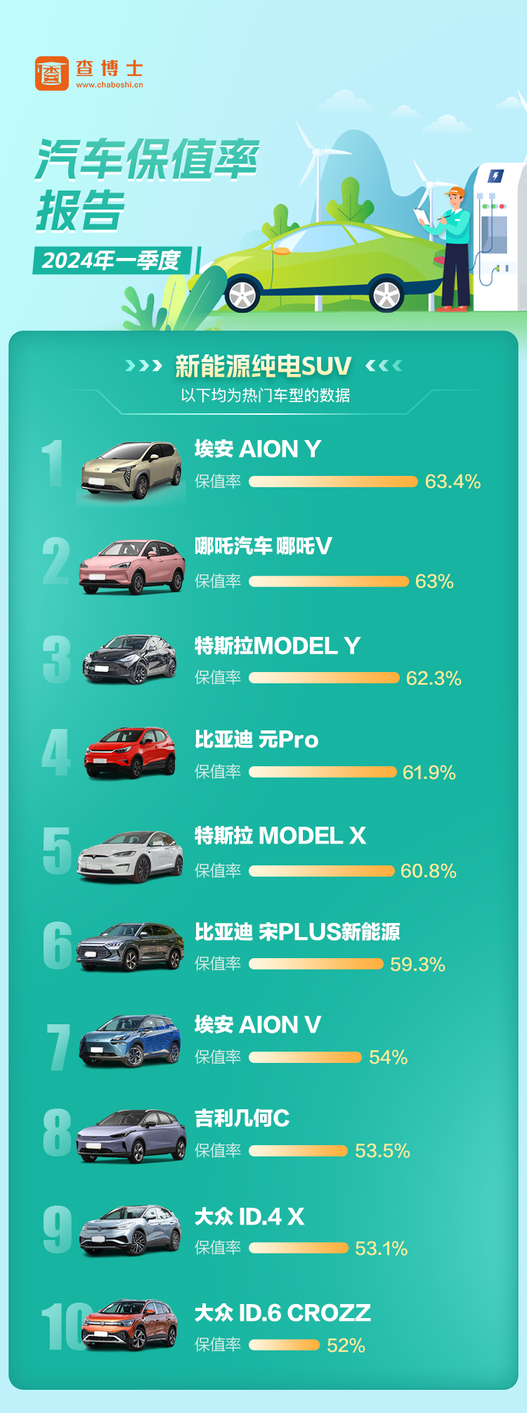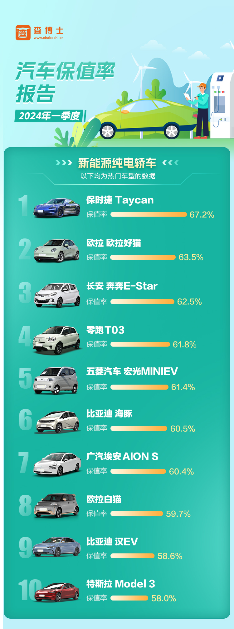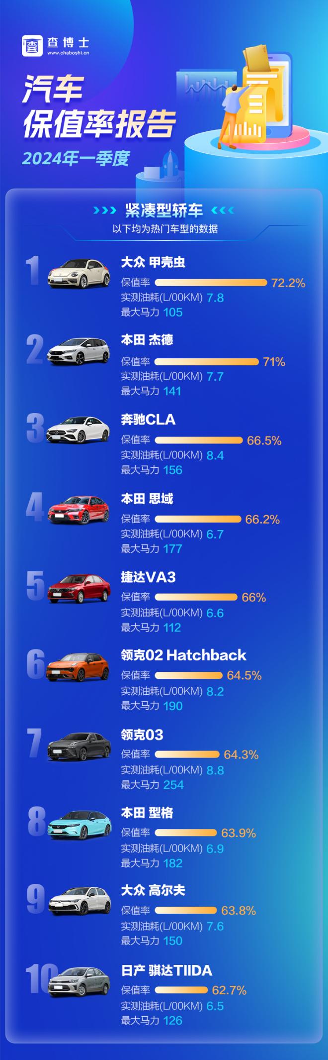 查博士2024年Q1季度汽车保值率报告,报告中包含了13种车型,从小型轿车到目前最受行业、消费者关注的新能源汽车。关于本期查博士发布的保值率来说,车龄为3年的二手车中,各细分市场保值率整体来说都有所下降。