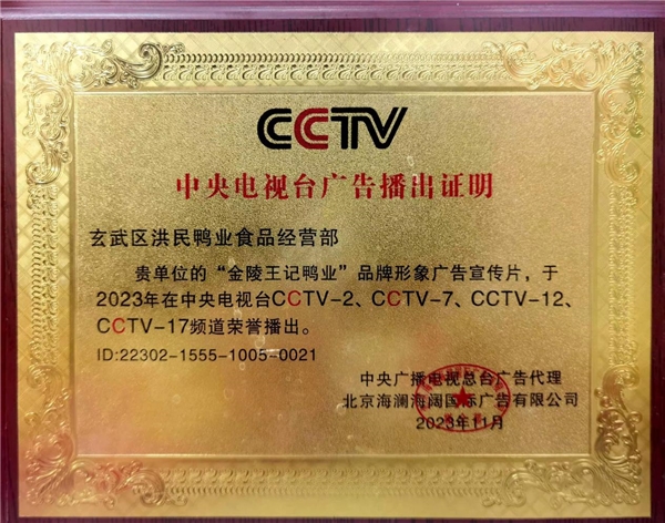 此次经过多次调查审核,凭借出色品质和产品,金陵王记鸭业不负众望,以良好的企业形象、卓越的产品品质、过硬的产品口碑顺利通过层层审核,才允许被播出,荣幸登录CCTV进行品牌广告展播。一方面充分体现了金陵王记鸭业的产品实力与口碑,另一方面也体现了其对自身产品的充分自信以及对未来前景发展有着十足信心。