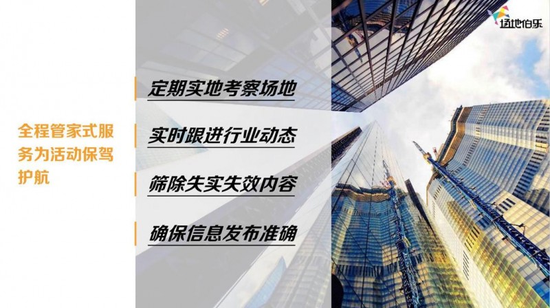 场地伯乐及时的响应:在线下单20分钟内完成首次沟通,4小时内提供首次场地推荐报告 ( 单一城市3-5个场地),客户提出修改建议后两个工作日内完成方案的调整并安排场地实地勘查。