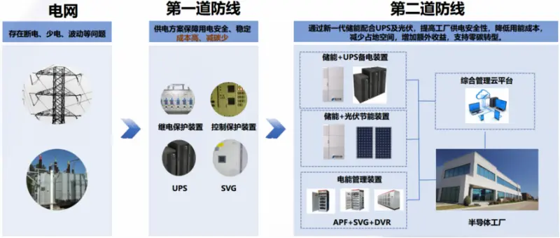 为解决电能质量问题,半导体行业通常采用继电保护与控制保护作为第一道防线。极光云能发挥储能产品及云平台控制优势,为半导体行业打造了电力供应的“第二道安全防线”。