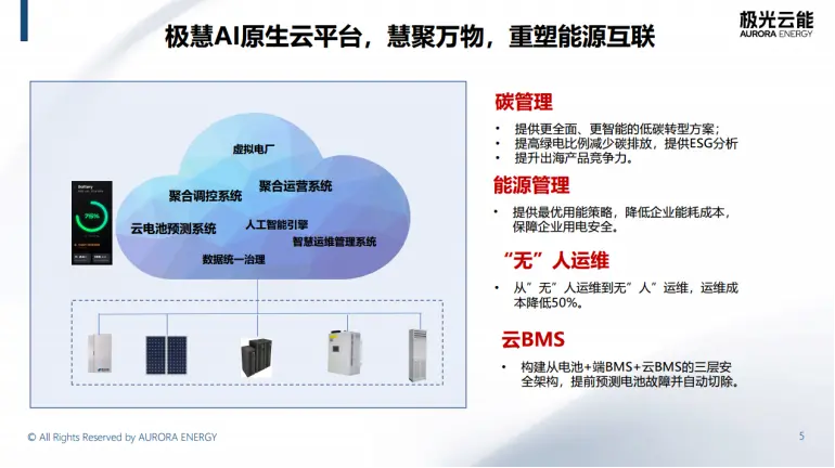作为专注于全栈自研的极光云能,它将储能系统视作可在云端智能调度的设备,而非仅是边缘端的硬件基础设施。极光云能以其更智能的云平台,充分发挥储能调节功能,实现了从被动到主动、从简单到智能、从集成到重构、从分散到聚合的转变。