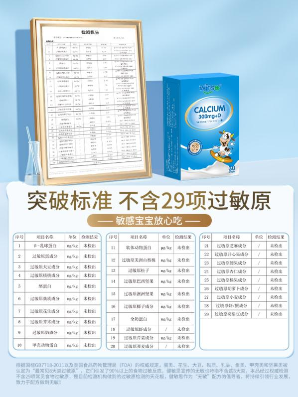 Witsbb健敏思品牌自创立以来,就坚持为敏感宝宝提供有效、安全的营养。4月15日,Witsbb健敏思专为健敏思维生素AD、健敏思小蓝盒液体钙、健敏思液体锌三款核心产品进行了第三方质检公司权威检测,检测结果显示不含29项常见食物过敏原。