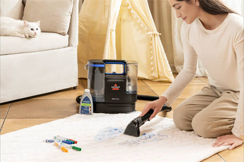 我们知道,吸力大小通常是衡量布艺清洗机清洁能力的关键指标,这次必胜新品最引人瞩目的一点就是它媲美商用清洁机的16900Pa暴风吸力,相比前一代产品提升69%,机身体积却减小20%。强劲吸力创造出的活水循环清洁,能做到深层瞬吸,从里到外清洁干净,通过“抽水泵”式高速抽干,还能直接脱水,不用等待长时间晾晒。无论是掉落在沙发地毯上的宠物毛发、食物残渣等干垃圾,还是宠物或儿童留下的尿渍、奶渍等脏污和异味,SpotClean C2都能一吸即除,轻轻松松就让布艺表面焕然一新。