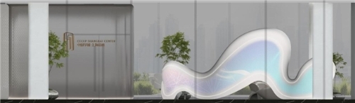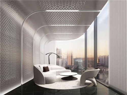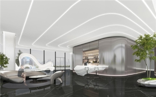 项目团队用智慧与艺术灵感打造“流动空间”,与扎哈一贯在建筑设计上大胆使用线条,异形打造前卫艺术建筑理念相契合。一楼的公共展示区,通过空间、光影、线条等多维度描绘办公空间的艺术氛围,深色石材地面,营造庄严大气的环境氛围,墙面装饰采用极具“呼吸感”的穿孔金属饰面,顶部线性灯带引导空间流动,门厅展示区的圆形电子沙盘造型如丝带般,宛若流水,如风中飘逸的艺术雕塑,其内部结合曲面展示屏,利用声光数字创意,以多媒体动态形式流动演绎,展示企业文化和项目品质,打造引人入胜的艺术空间。二楼的艺术画廊和VIP洽谈室延续了整体设计手法,削弱空间内外角,通过大面积落地窗将杨浦滨江自然景观引入室内,呼吸之间纵览开阔美景。