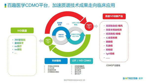 在姜博士的报告中,还分享了百趣经过十数年的在组学标志物开发、转化、产品开发、临床注册和商业化等方面的探索与积累。百趣凭借着丰富的经验和能力,正式推出了全新的“百趣医学CDMO模式”,旨在打造一个质谱产品转化的创新工厂,为临床科研人员和企业提供临床质谱领域的全方位支持,加速质谱技术产品的商业化进程。