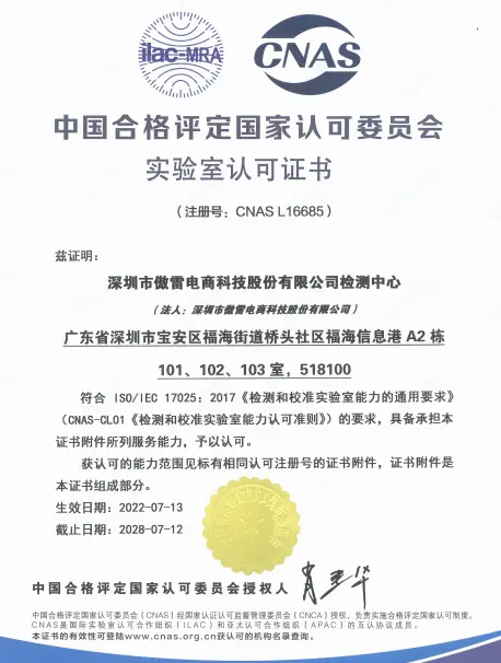 傲雷拥有独立实验室,是中国户外移动照明行业首家获得中国国家认可委员会 (CNAS)认证的实验室。这一认证代表着实验室具备了国家和国际认可的检测能力,象征着集团对户外照明产品的质量、安全性和性能致力于最高标准的承诺,为整个行业树立了新的标杆。