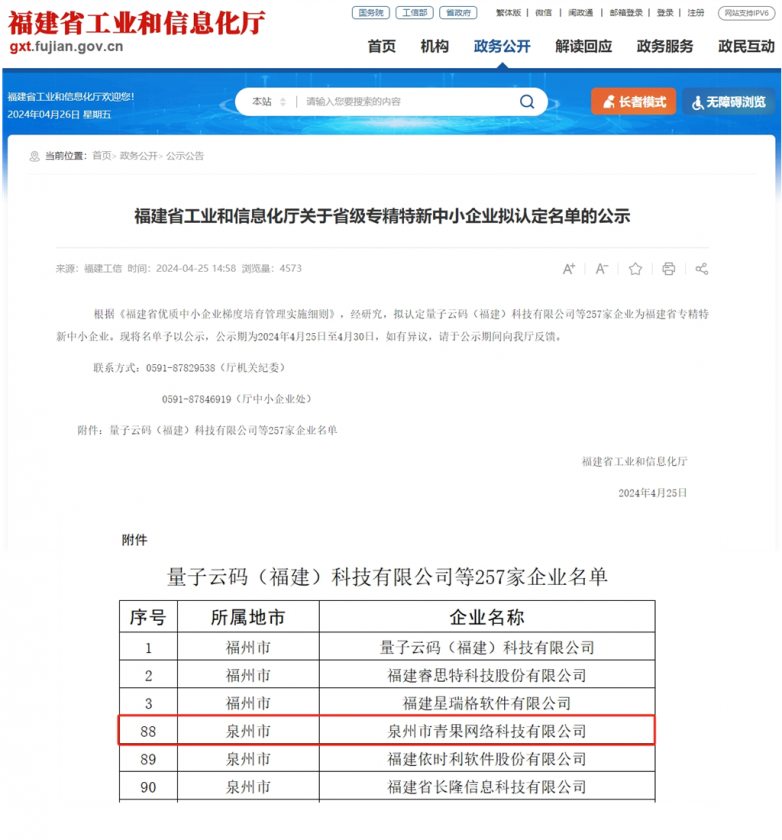 近日,福建省工业和信息化厅发布关于省级专精特新中小企业名单。青果网络凭借在大数据创新应用,融合数据全生命周期管理能力、多云融合管理能力、数字资产安全管理能力等多元核心能力,创新型以数据激发企业生产力,被评定为2024年福建省专精特新中小企业。