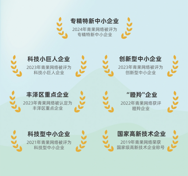 凭借着技术创新和精量化市场需求的产品体系,目前青果网络已经成功斩获了国家高新技术企业、科技型中小企业、“瞪羚”企业、创新型中小企业、科技小巨人企业、专精特新中小企业、丰泽区重点企业等多项权威性的荣誉。