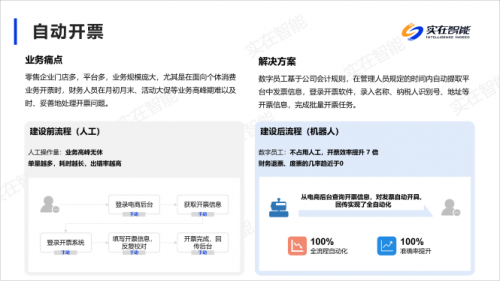 在部署实在Agent后,数字员工基于公司会计规则,在管理人员规定的时间内自动提取平台中发票信息,登录开票软件,录入名称、纳税人识别号、地址等开票信息,完成批量开票任务,并自动回传到电商后台。与人工相比,数字员工开票效率提升7倍以上,开票准确率维持在100%,财务退票、废票的几率趋近于0。