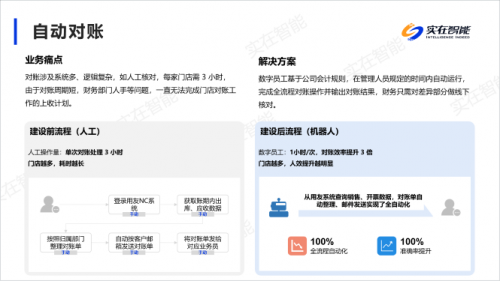 在自动化升级后,单次对账处理时间由3小时缩短至1小时,效率提升3倍,准确率100%,通过部署多个数字员工,0系统改造,即实现了数万家门店的对账工作上收,员工从机械的工作中解脱。